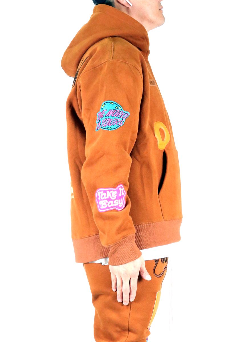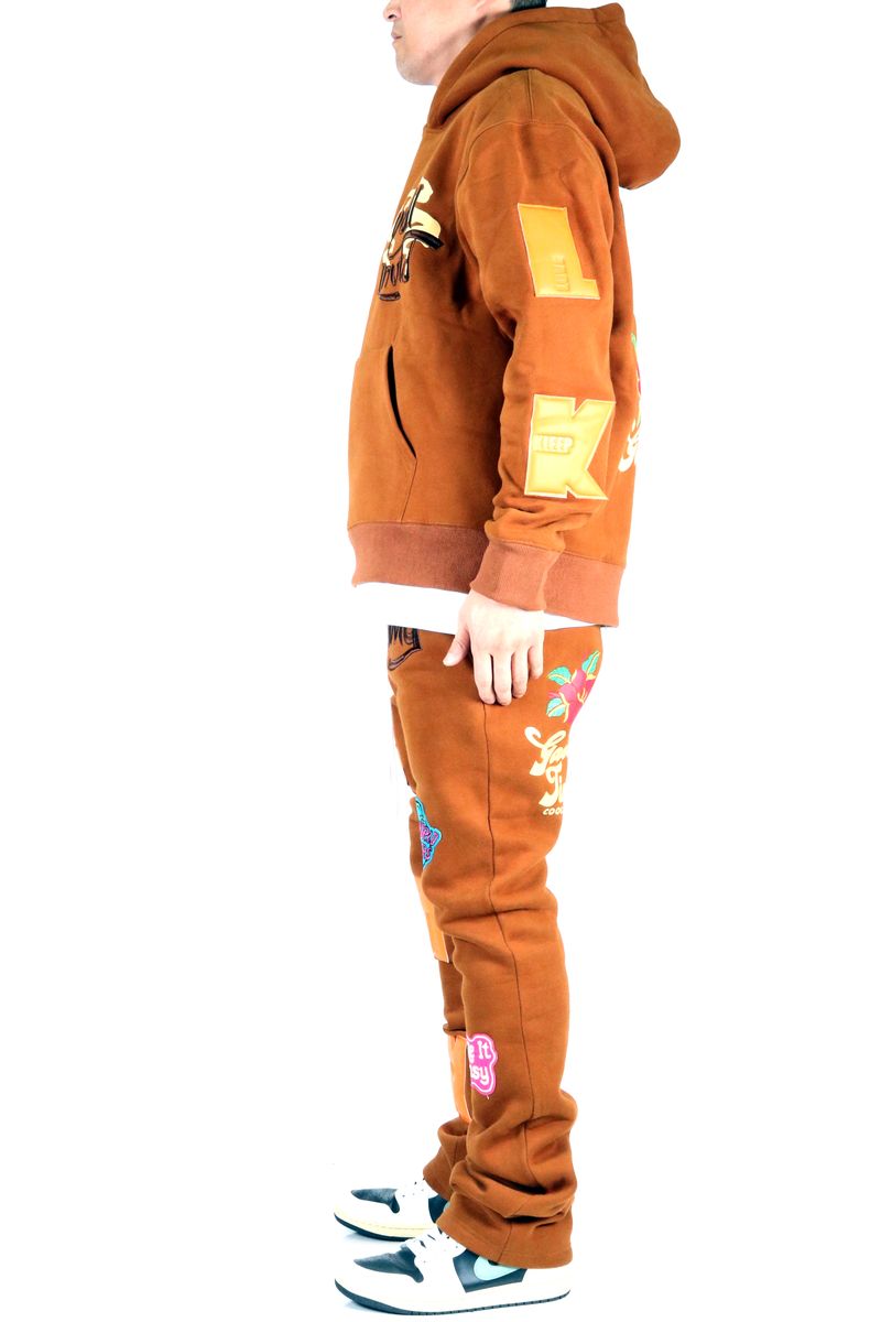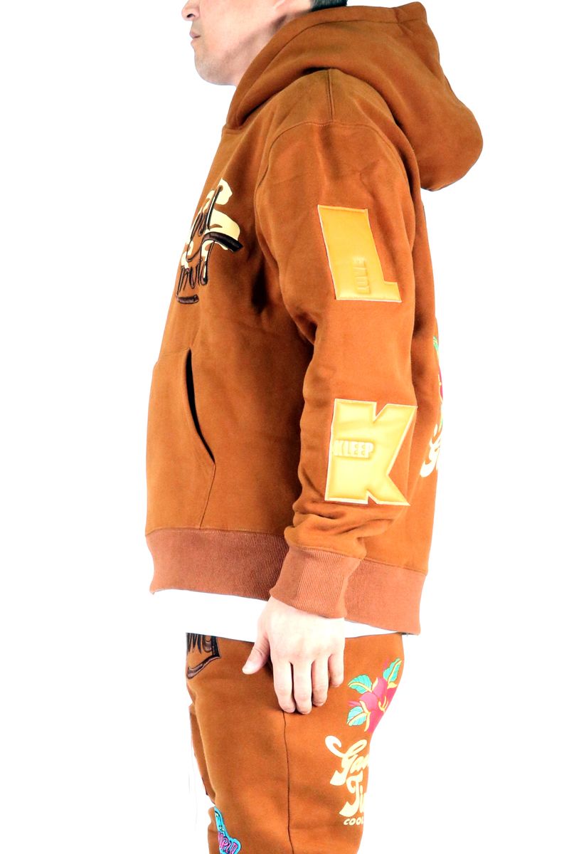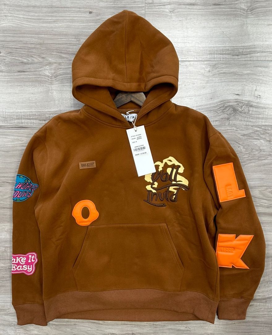 Indulge in luxury with the Love To Kleep {GEORGE(BROWN)} hoodie. Made with heavy weight (360g) brushed fleece, this pullover features chenille patches on the sleeves and a puffy PU letter patch. The glow in the dark print adds a touch of exclusivity. Designed by L.T.K and imported for you.
